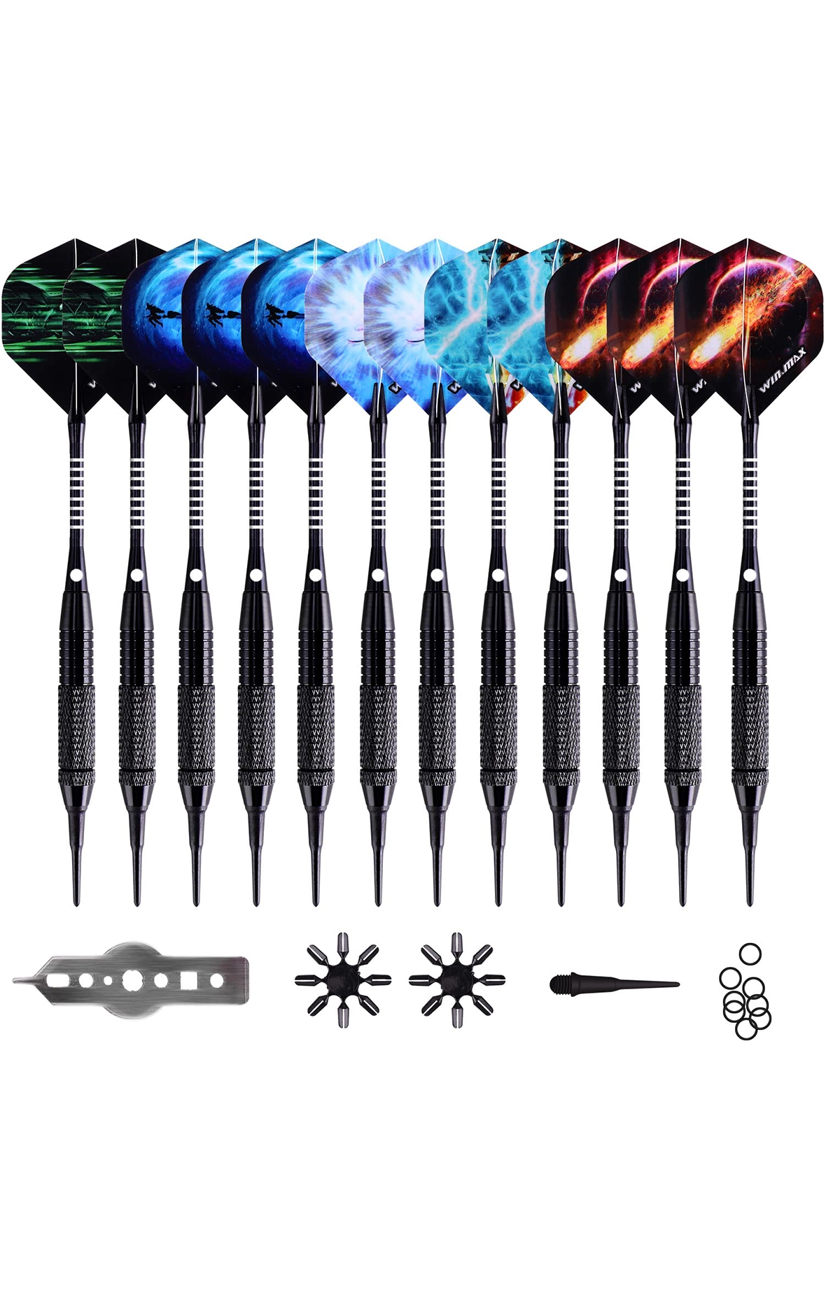Complete your dart game with WIN.MAX soft tip darts, featuring 12 durable 18g darts, 100 extra tips, flights, protectors, and wrench—perfect for electronic dartboards.